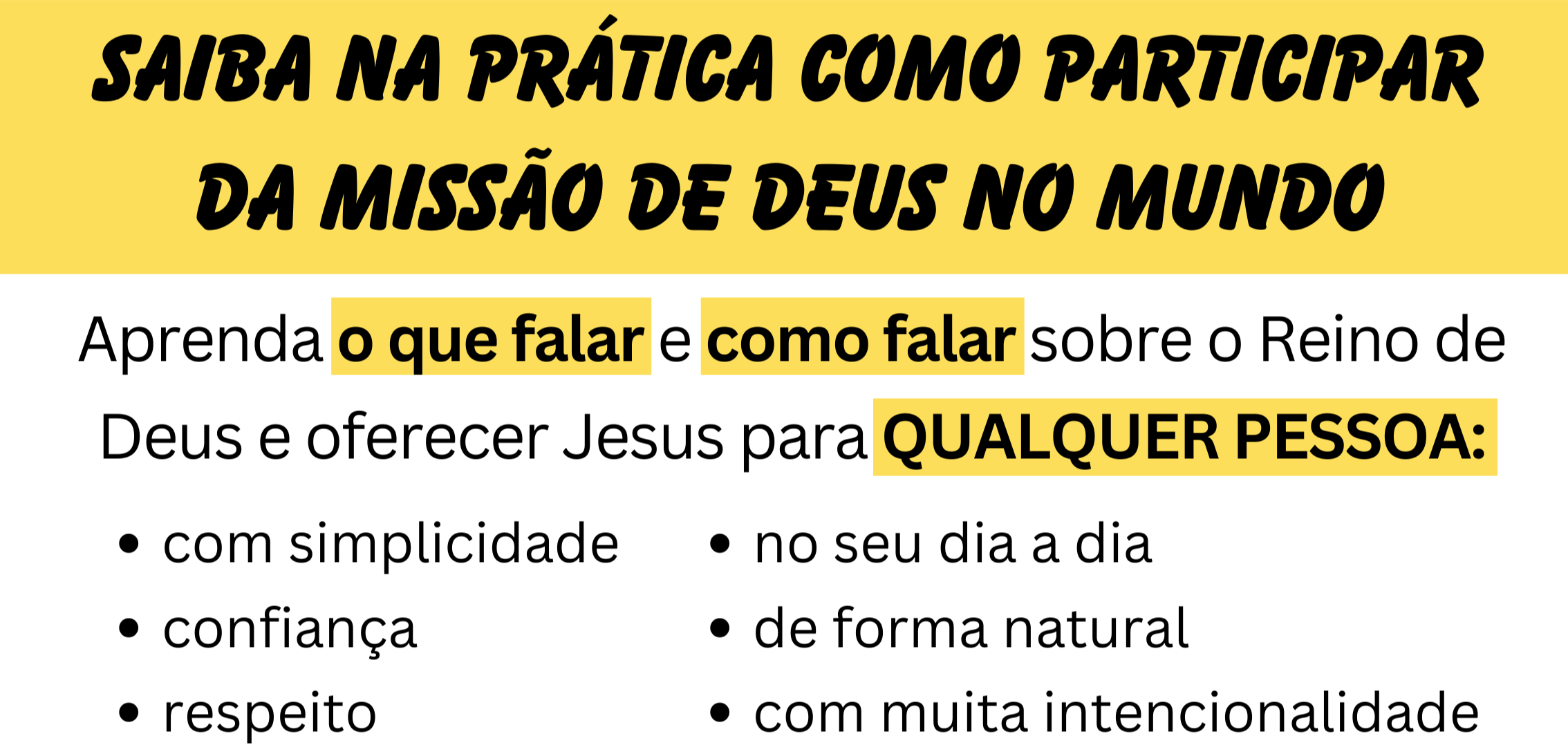 - Quer aproveitar as oportunidades no ambiente de trabalho, estudos e lazer, e ser intencional ao apresentar Jesus a pessoas que nunca ouviram - de forma natural, sem se sentir inseguro(a), ofensivo(a) ou pedante.